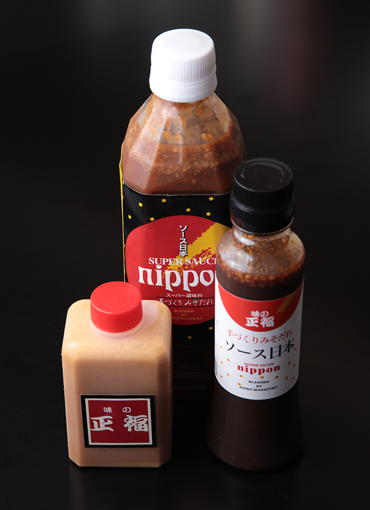正福の味を家庭でも楽しみたい!というお客さまの声から生まれたのが「ソース日本」。 和・洋・中華と、どんな素材ともよく合い、味に深みとコクが生まれる万能調味料。隠し味に使えば料理の腕がぐんと上がります。ご家庭で「あと一品欲しい!」というときの強い味方です。いつもの料理をワンランクアップさせる万能調味料「ソース日本」をぜひご利用ください。